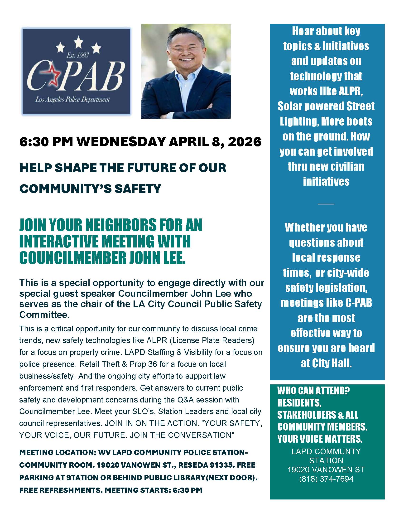 Councilmember John Lee serves as Chair of the City Council Public Safety Committee. As the Chair of the Public Safety Committee, Councilmember John Lee oversees the legislative and budgetary priorities for the Los Angeles Police Department (LAPD) and other first responders. Given his recent focus on technology-driven crime prevention, staffing shortages, and community-based solutions. The April 8th meeting will be a great opportunity for our community to discuss local crime trends, new safety technologies like the ALPR (Automated License Plate Reader) program, and the city's ongoing efforts to support our local police divisions.