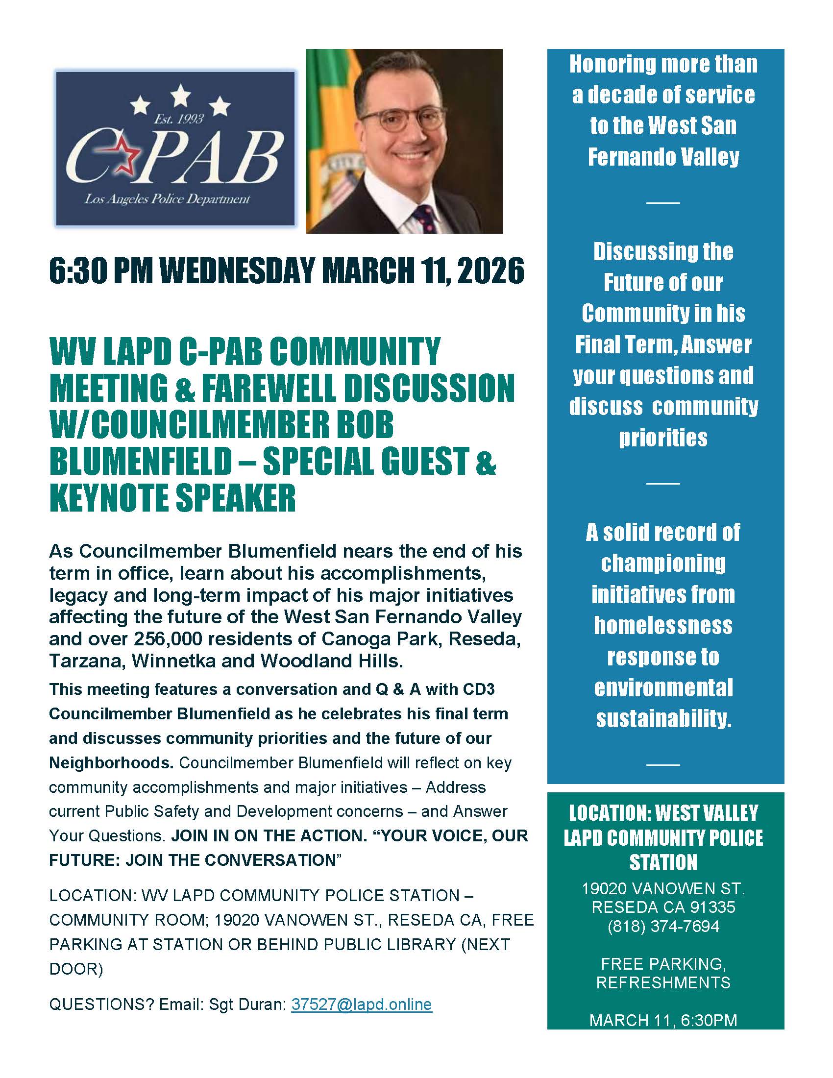 Please mark your calendars and plan to attend West Valley LAPD’s C-PAB Community meeting on Wednesday March 11th as we feature LA City CD3 Councilmember Bob Blumenfield as special guest and keynote speaker. Meeting Starts: 6:30PM at the West Valley LAPD Community Police Station – 19020 Vanowen St., Reseda 91335.
