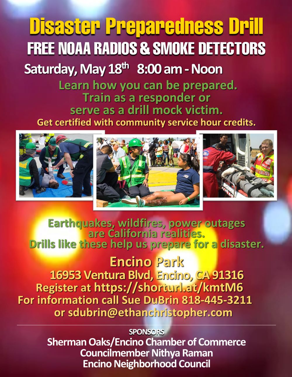 Calling on Valley residents to get prepared, a coalition of more than 20 local emergency response and healthcare organizations will be conducting a disaster response drill in Encino Park on Saturday, May 18th from 8 a.m. to noon. Sign up to participate as a responder or simulated victim at https://shorturl.at/kmtM6.